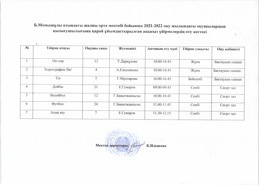 2021-2022 оқу жылындағы оқушылардың қызығушылығына қарай ұйымдастырылған ақысыз үйірмелердің өту кестесі