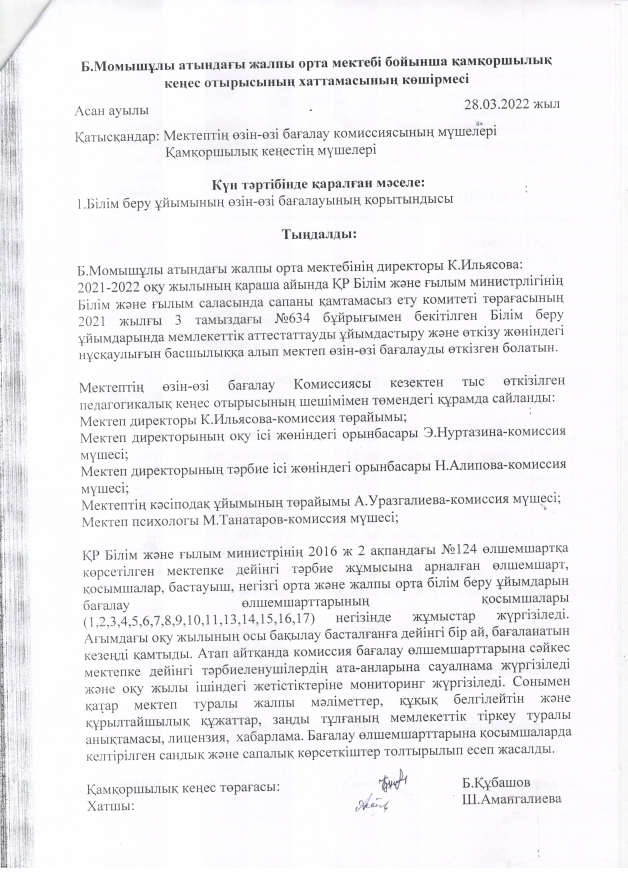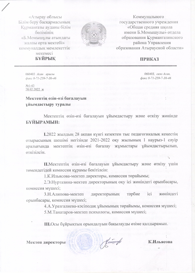 2021-2022 оқу жылының мектептің өзін-өзі бағалауын ұйымдастыру туралы бұйрығы