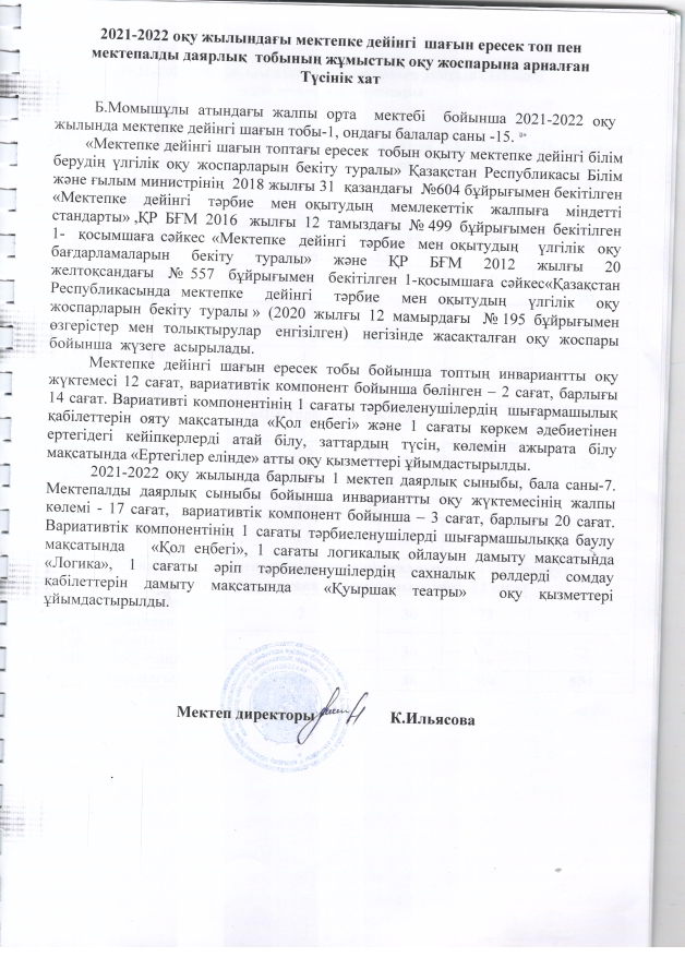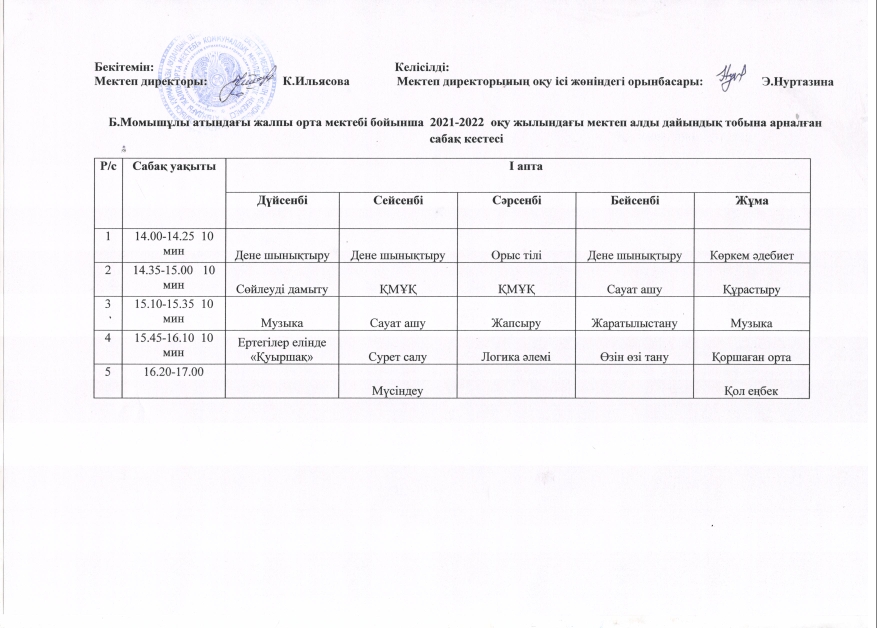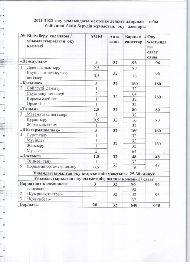 2021-2022 оқу жылындағы мектеп алды дайындық тобына арналған сабақ кестесі