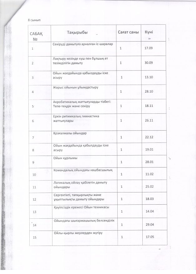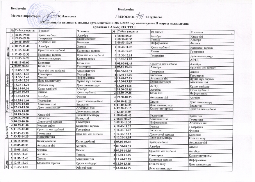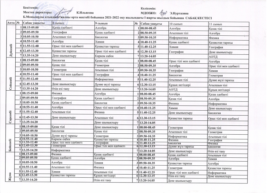 2021-2022 оқу жылының 8-11 сынып І, ІІ жарты жылдық сабақ кестесі