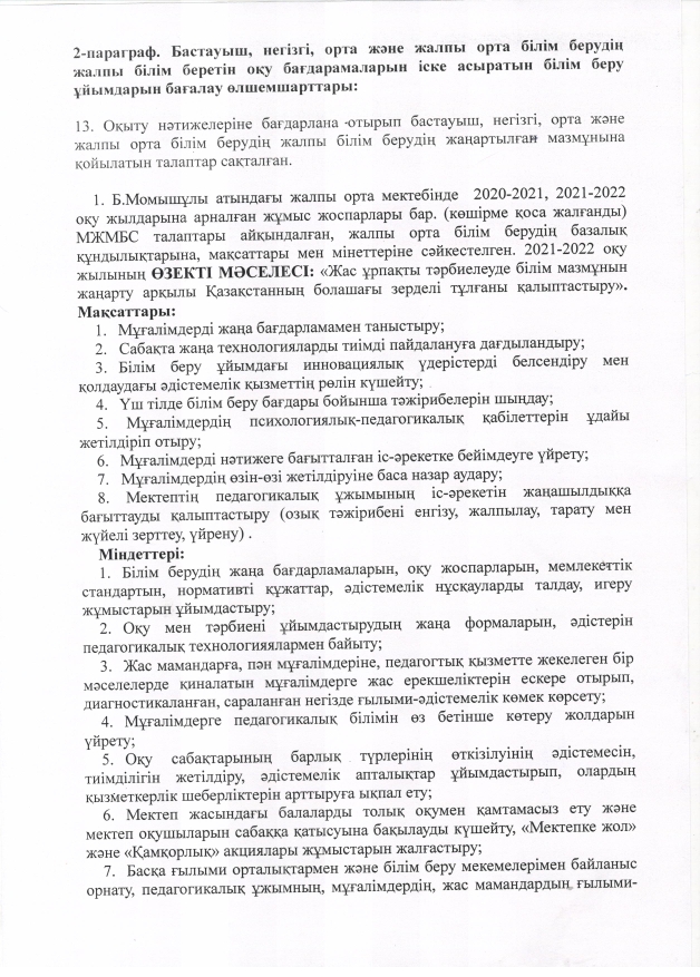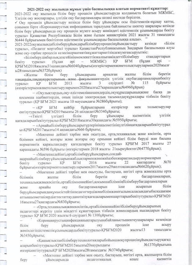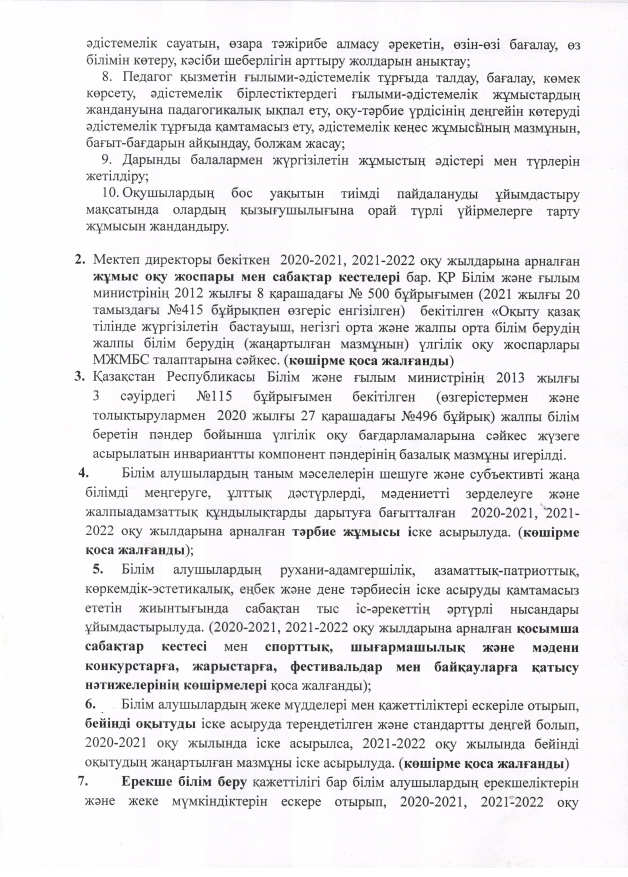 2021-2022 оқу жылының мектептің жылдық жұмыс жоспары