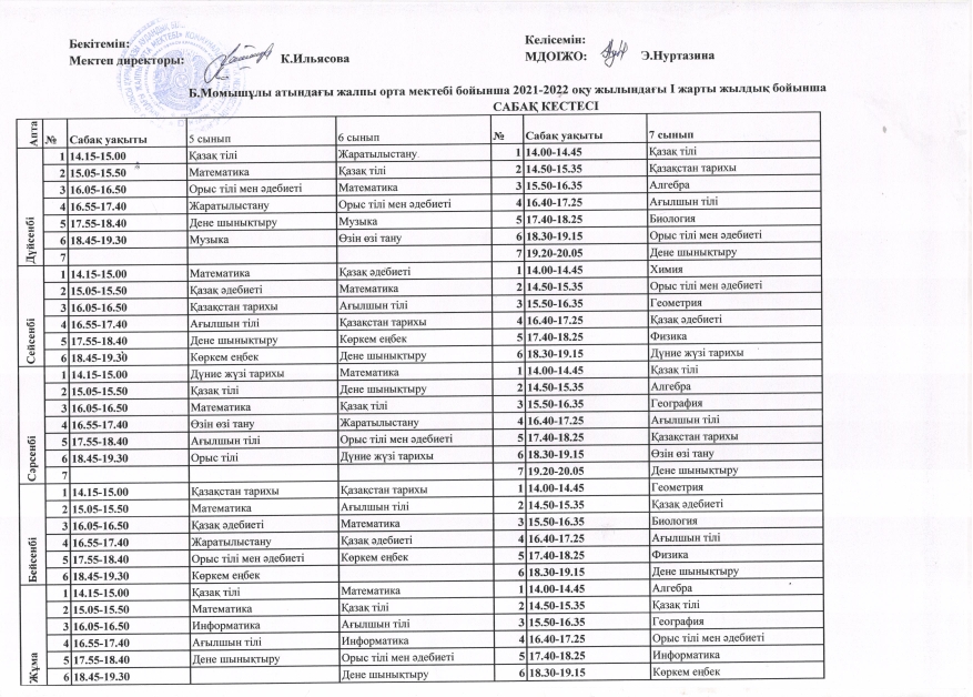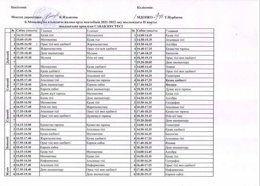 2021-2022 оқу жылының 5-7 сынып І,ІІ жарты жылдық сабақ кестесі