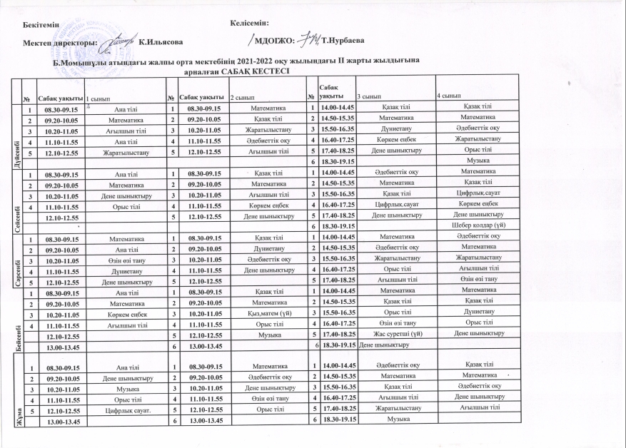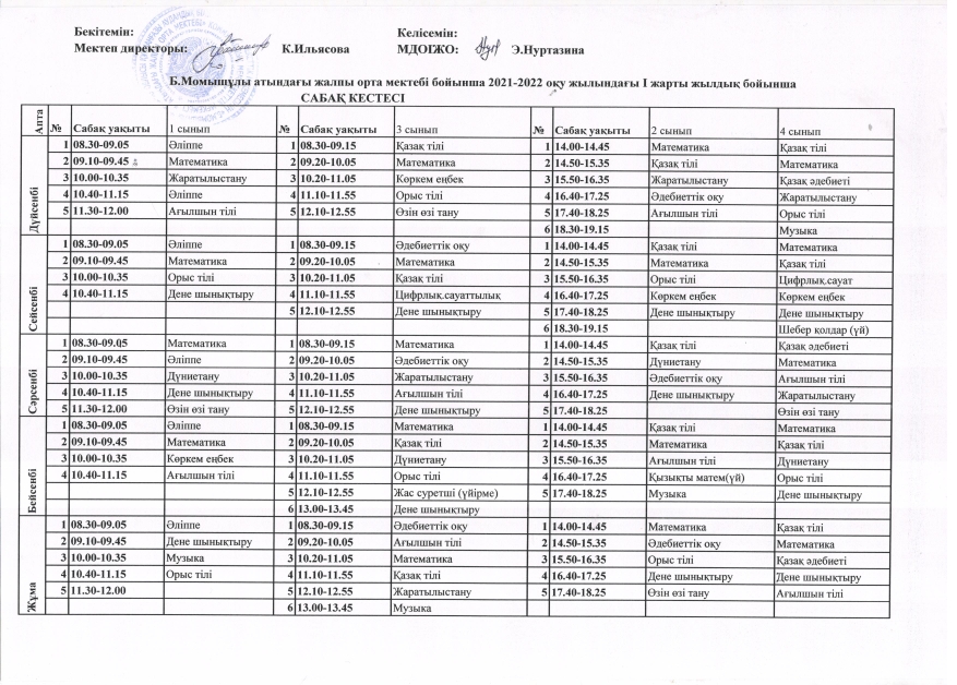 2021-2022 оқу жылының 1-4 сынып І, ІІ жарты жылдық сабақ кестесі