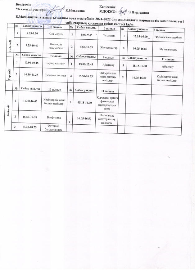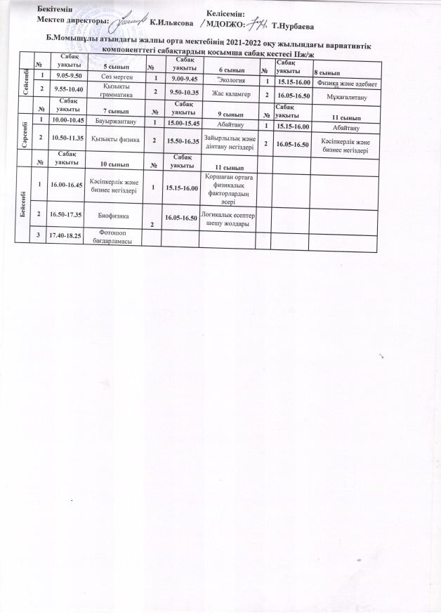 2021-2022 оқу жылының вариативтік компоненттегі І,ІІ жарты жылдық сабақ кестесі