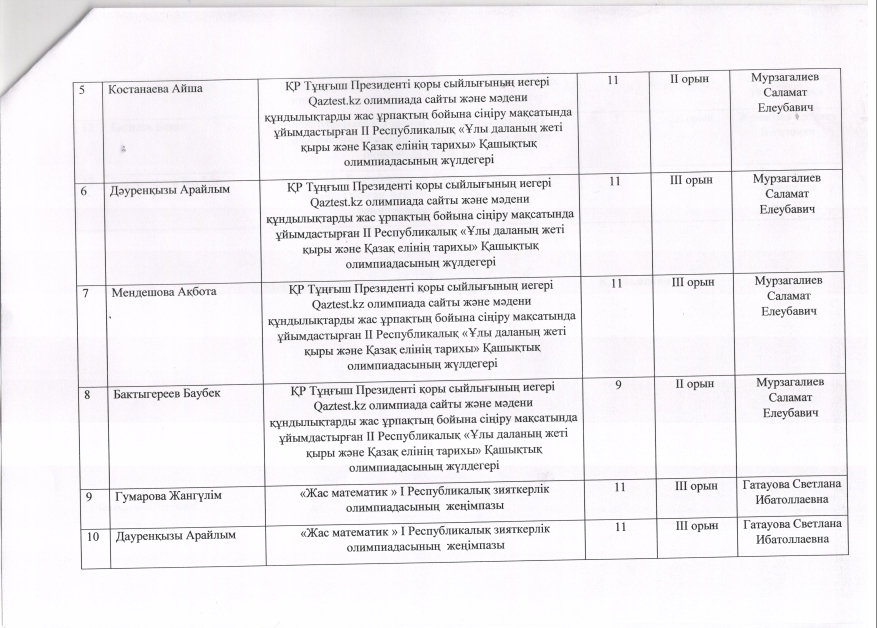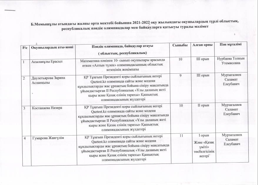 2021-2022 оқу жылындағы оқушылардың түрлі облыстық, республикалық пәндік олимпиадалар мен байқауларға қатысуы туралы мәлімет