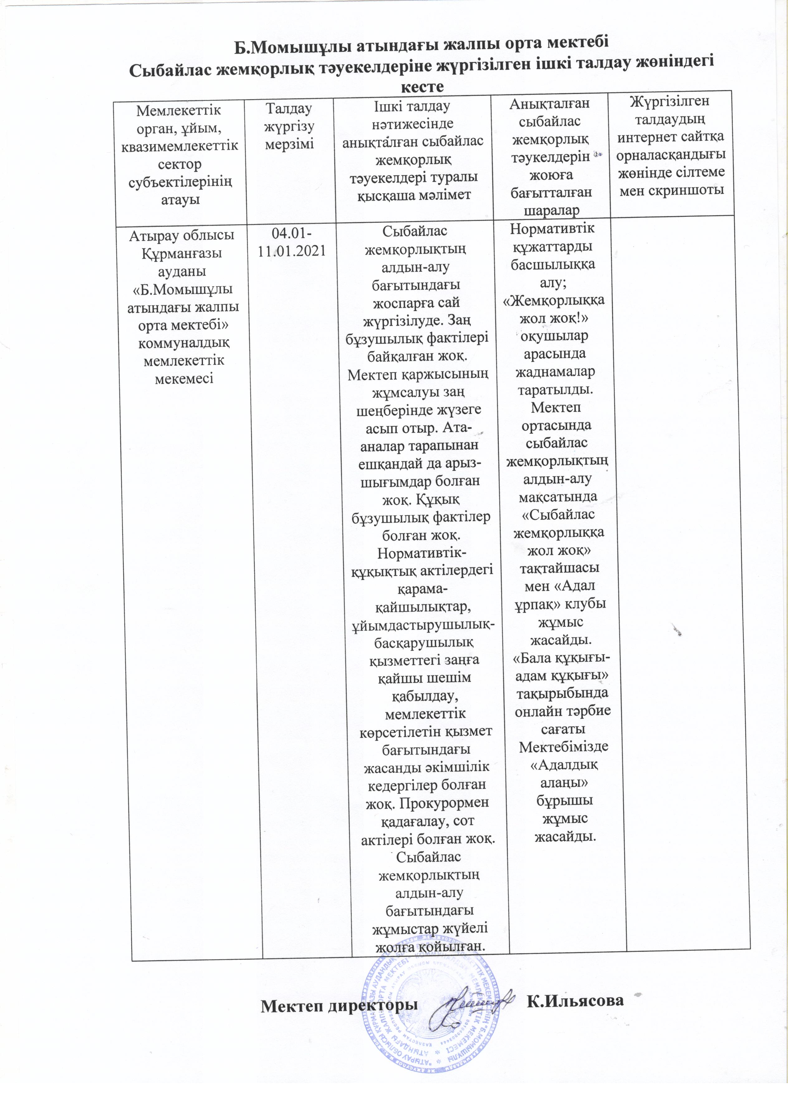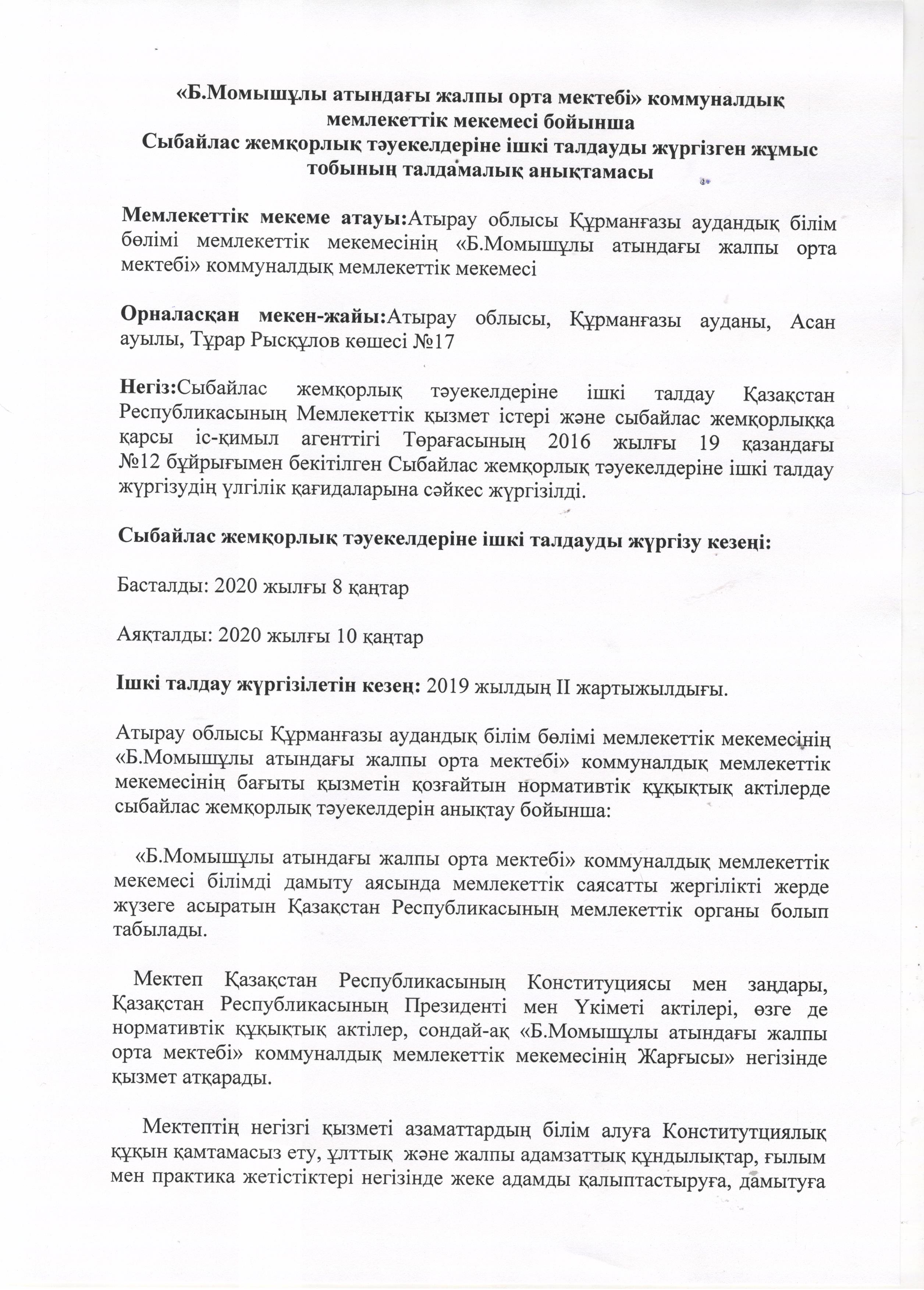 Сыбайлас жемқорлық тәуекелдеріне ішкі талдау жүргізілуі туралы