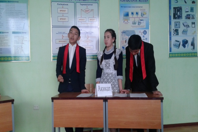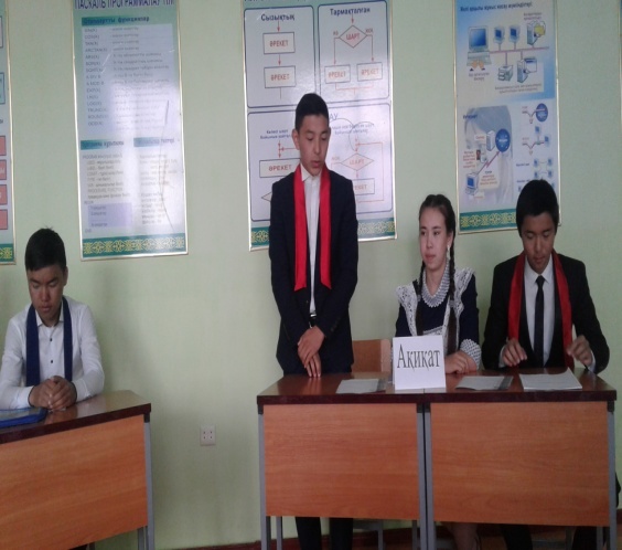 9 сәуір күні «Қауіпсіз интернет» республикалық ақпараттық науқаның аясында информатика пәні мұғалімдері Е.Жумабаев пен Т.Нурбаева бірлескен түрді «Интернетті қауіпсіздендіру бағытындағы шаралар» тақырыбында 9-11 сынып оқушыларымен дебат пікірталас өткізілді. Негізгі мақсаты: оқушының ой-өрісін дамыту, іздендіру, сөйлеу мәдениетіне тәрбиелеу. Ойын барысында «Ақиқат» және «Парасат» атты екі топ өз ойындарын бастады. «Ақиқат» тобын да 1 спикер Талғатова А. 2 спикер Жоламанов Д.және таймкипер Меңдешұлы С. жақтаушы топ болды. «Парасат» тобының 1 спикері Шапихов Н 2 спикер Дәуренқызы А және таймкипер Тұрақбаев Ш даттаушы тобын құрды.Әр топ жоғарыдағы тақырып бойынша ережеге сай ойынды өткізді. Бірінші жақтаушы топ өзінің кейістерін және кілт сөздерін пайдалана отырып статистикалық мәліметтерін берді. Даттаушы топ олардың келтірген тақырыптарындағы мәнді мағыналы дәлел-дәйектеріне барынша қарсылық таныта білді. Жақтаушы топтың 2-ші спикері өзінің 1-ші спикерінің айтқан мәлімдемелерін барынша қорғауға тырысты «Интернет артықшылықтары мен кемшіліктері» болады оның өскелең ұрпақ үшін маңызды екендігін ашып айтты. Даттаушы топ «Парасаттың» 2 спикері қазіргі қаржылық дағдарыспен байланыстырып елдің жағадайына кері әсері болады деп санады. Қортындысында жақтаушы топ «Ақиқат» тобы ережеге сай ойын көрсетіп жеңіске жетті.